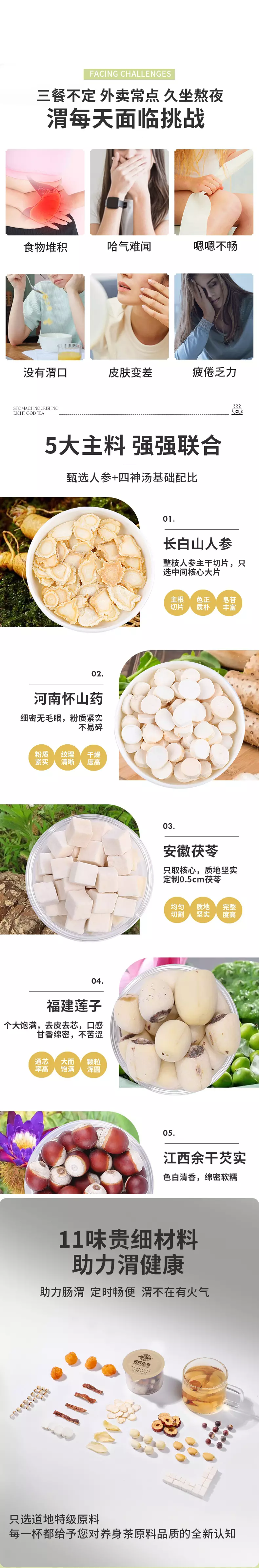 原料与配料: 山药、茯苓、薏苡仁、莲子、实、大枣、桂圆、橘皮白扁豆、百合、人参